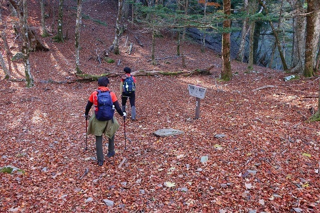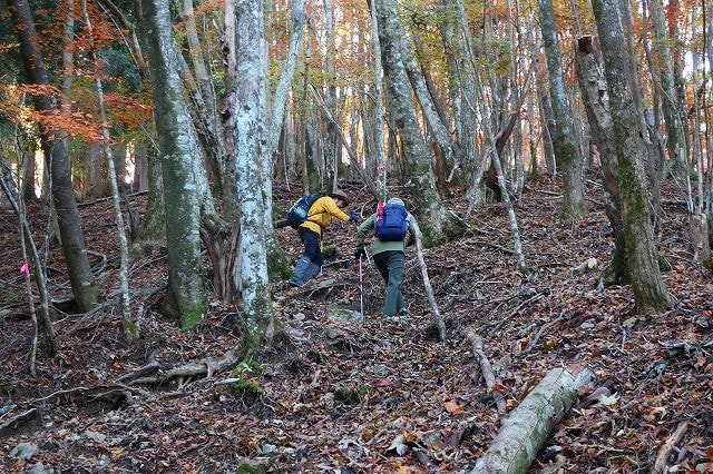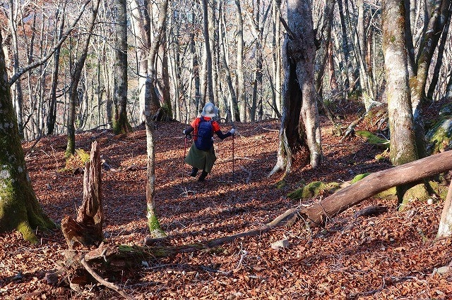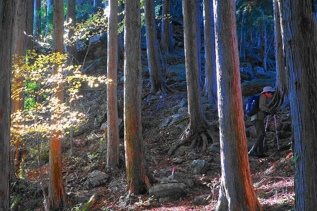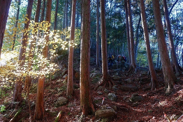 杉林から自然林の中の道になるとシロモジだろうか、黄色く色づいた木々が目立つ。