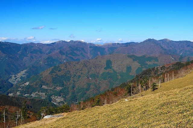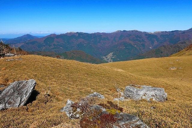 その笹原から一段上がって乗っ越すと正面に矢筈山、そして落合峠や黒笠山の祖谷山系の