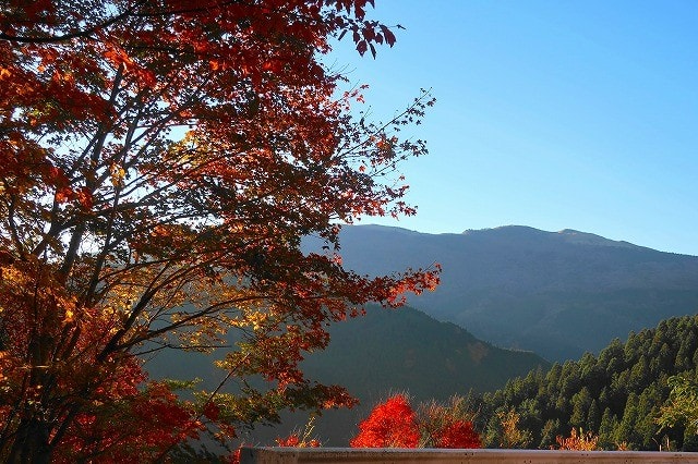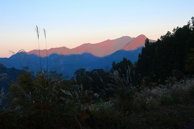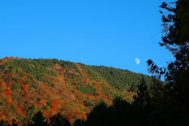 あと、西山林道をいやしの温泉へと下って行く途中で、三嶺からの彩りの尾根越にもう月が