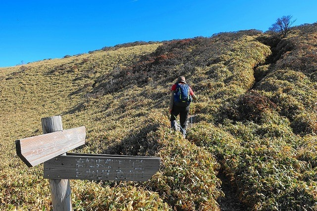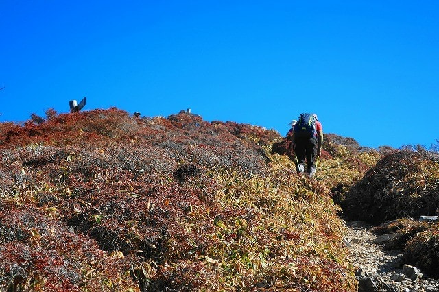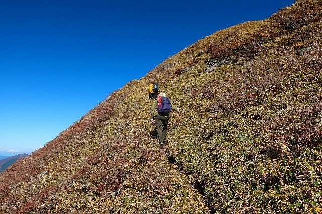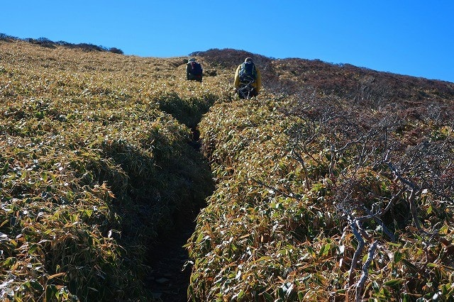 また九十九折れの道が続いて行く。次第に足元に背の低いクマザサが現れると、そろそろ