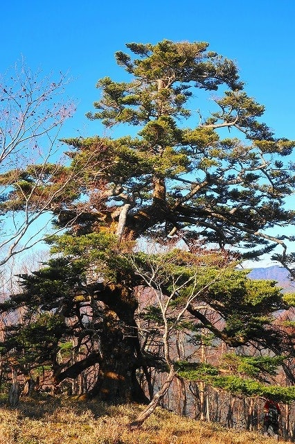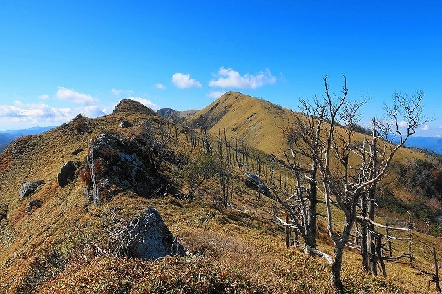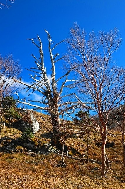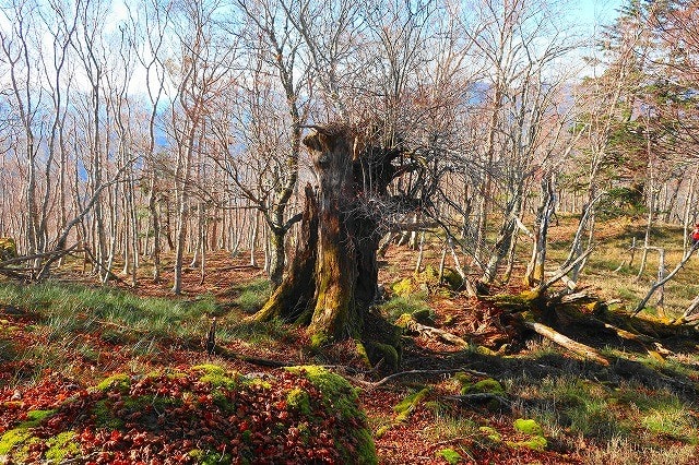 元だけが残って立っている枯れた木を始めとして、特徴的な巨木がこの尾根には立っている。