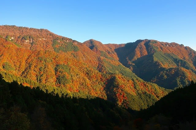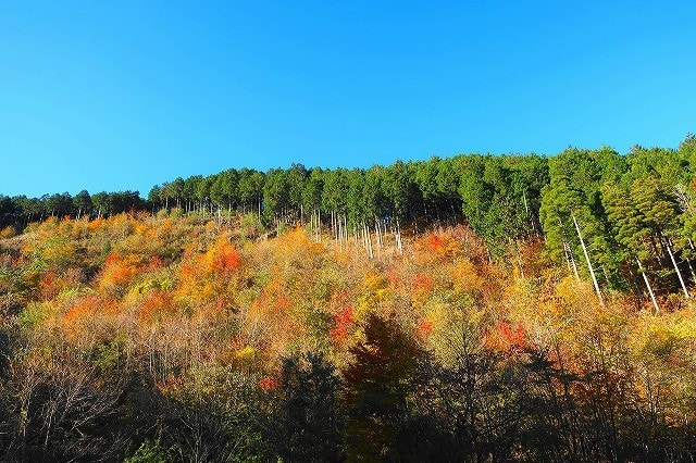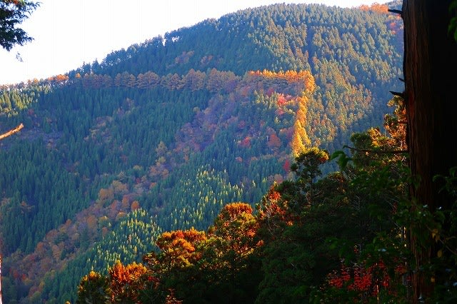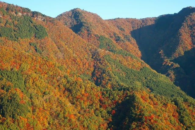 西熊山からの北尾根の山肌では、杉の濃い緑の中自然林が紅葉して矢印のように見える。