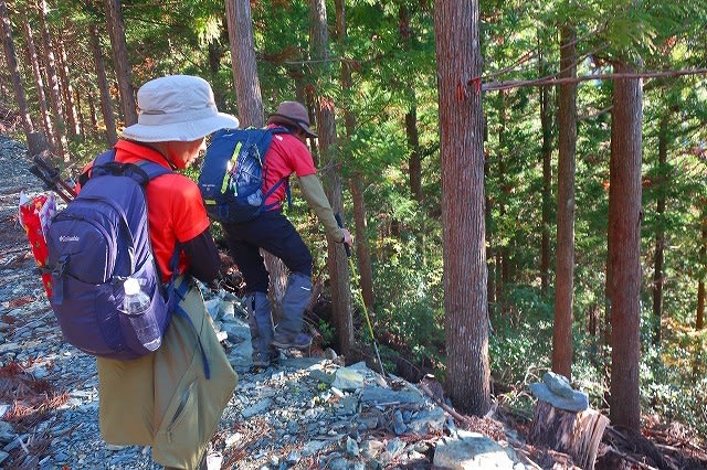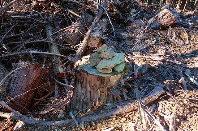 ここからは何度も作業道を横切るようになるが、その都度切株の上の石を目印に林の中に