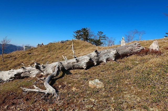 小ピークに力つき横たわる大きな大きな白骨樹。その小ピークの先にも背の