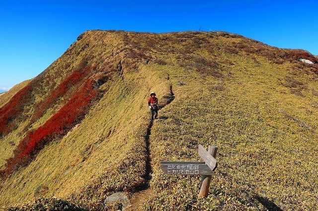 笹原を縦横無尽に走る獣道の中にあって、ひと際濃く続く登山道の線。たおやかな