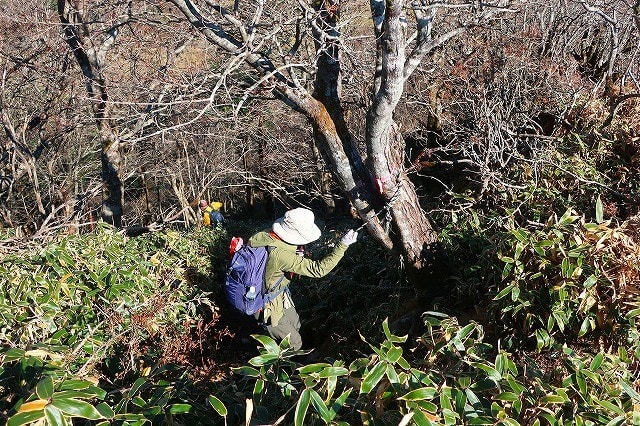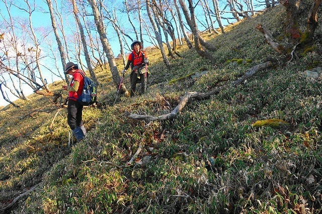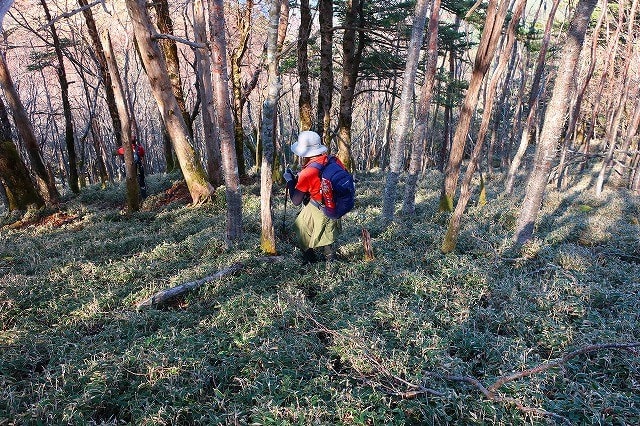 林床がクマザサの急な斜面をひっくり返らないように注意深く下って行く。
