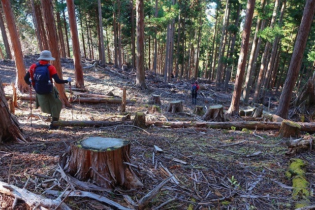 その反対を見ると今から登って行く杉林が見えた。伐採地には既に雑木が生えて、その