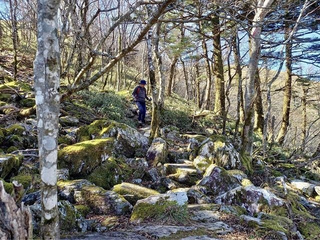 尾根の北側に回り込む場所にはロープがかかっていて、それを降りると苔むした岩。そこを