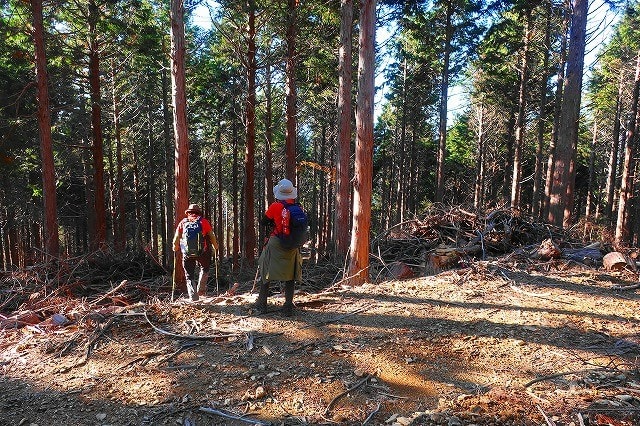 前をよく見ながら尾根らしい雰囲気を確認しながら下って行く。ただ伐採された木の枝が