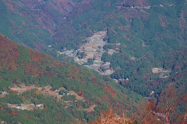 黒笠山から寒峰へと続く峰々。その麓には落合集落が見える。
