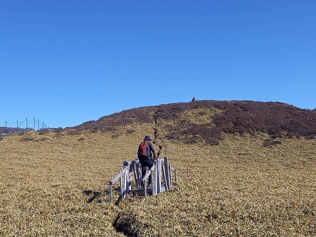 稜線に立った途端に冷たい風が吹き抜けていく。途中で上着を脱いだ奥様たちが、
