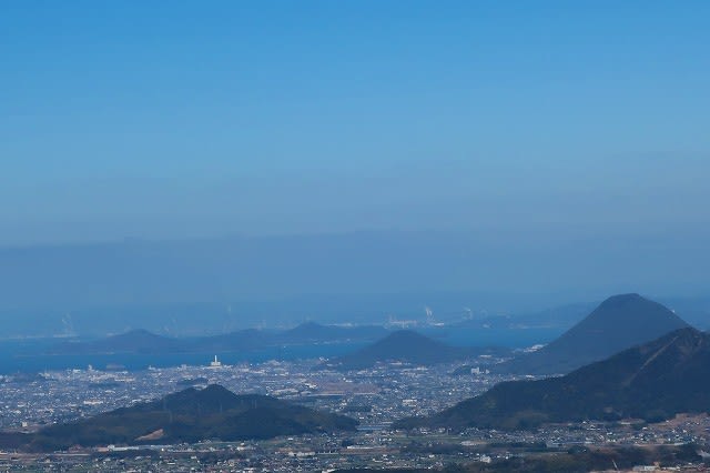 北を見ると城山と飯野山の間に、坂出の番の州の工場の煙突から上がった煙が見える。