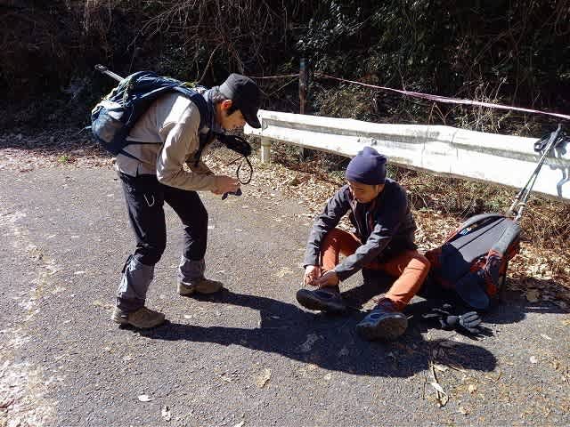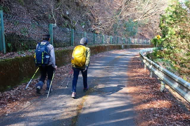 林道・辷り尾多治川線を歩いて行く。日陰の道はさすがに寒く、服装は耳まで