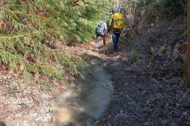 道が南から東に向かうと谷筋の道になる。ここでも倒木が多く足元もザレた場所がある。