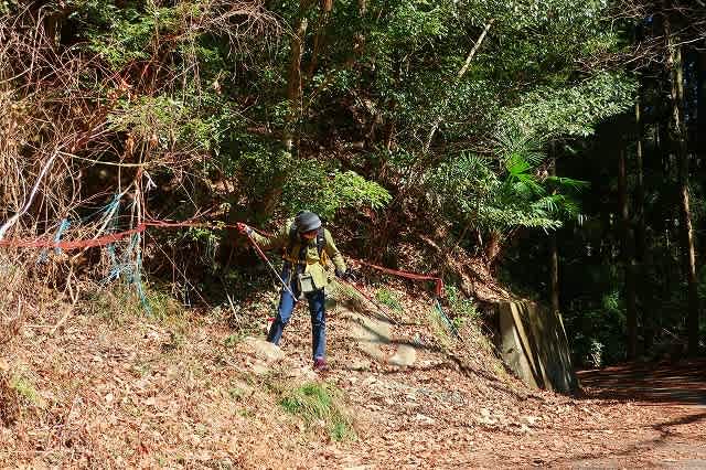 下り坂から鞍部に差し掛かると青いPE平ロープが道を塞いでいた。
