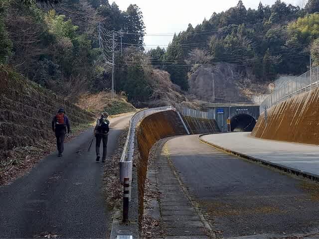 なった場所に車を停めて歩き始める。県道の歩道をトンネル方向に少し歩き、手前で