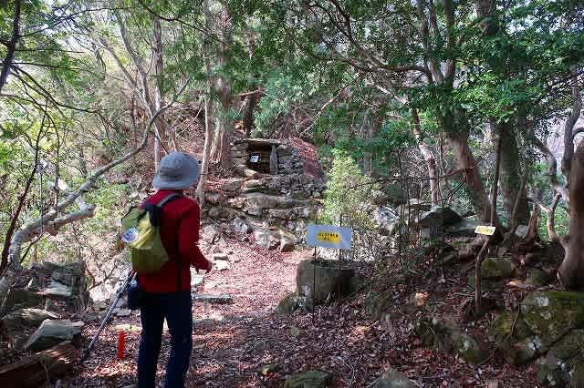 稼勢峠まで戻り更に西に尾根を辿っていくと夷神社跡に着いた。平場の石積みと