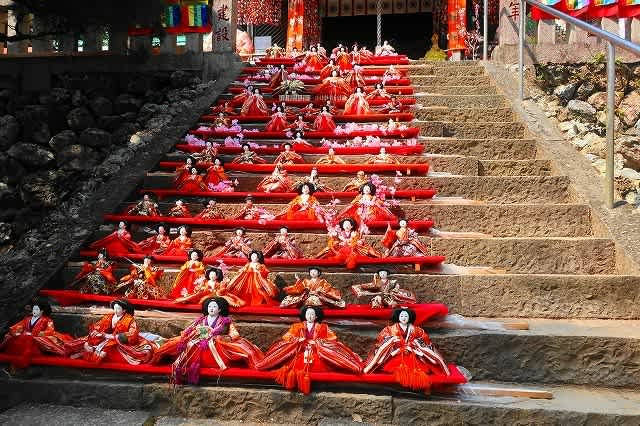 坂本八幡神社の石段に並べられたお雛様。町家の軒先に飾れられたひな人形。