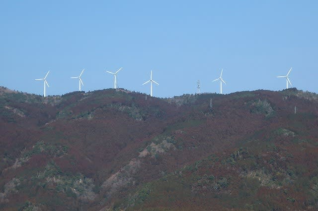 白い風力発電の羽がゆっくり回っているのが見えた。大川原高原の稜線だろう。