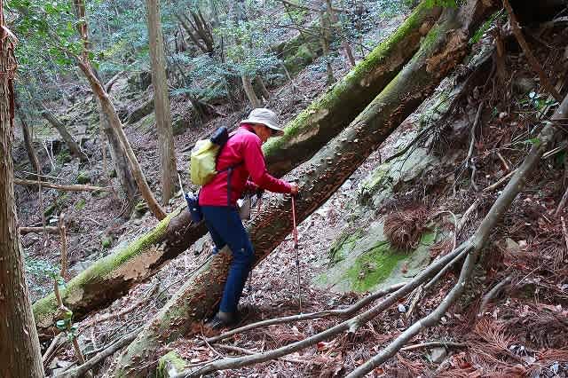 地道になると途端に道が荒れて来た。倒木を跨ぎロープを掴んでの乗越すとまた