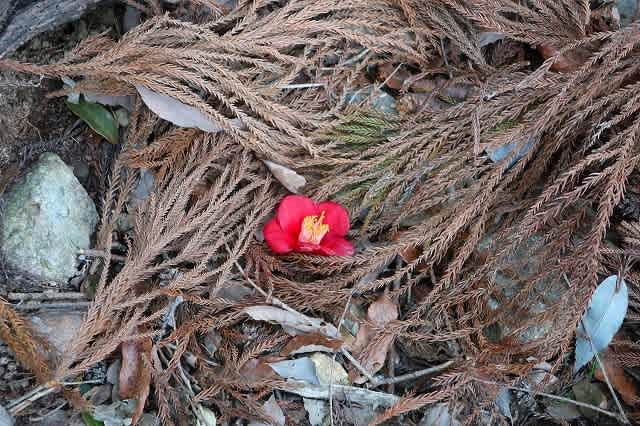 椿の落花が一輪。周りを見て見ると椿の木が何本かあった。
