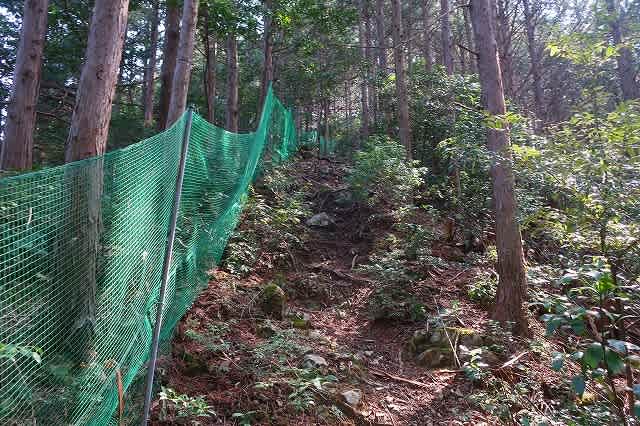峠からは東に尾根を進んで行く。緑のネットに沿って急登が続く。