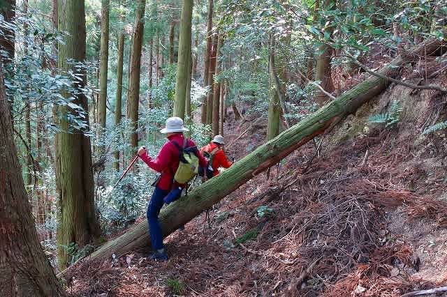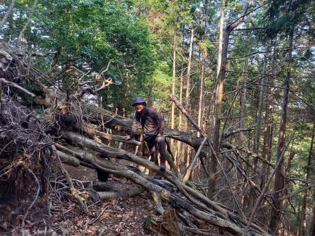 その倒木を過ぎても何ヵ所も道を塞ぐ木が多く、跨いだり潜ったりとまるで障害物競走の様相。