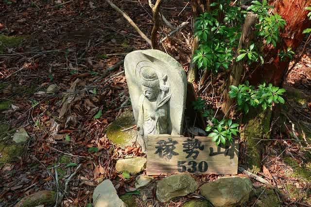 何もなく、さらに先のピークに小さな石仏と稼勢山530mと書かれた山名標があった。