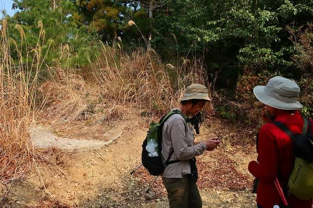 行ってみましょう!』と声を掛けて進んで行くと、鞍部になった鳥居の記号の場所には