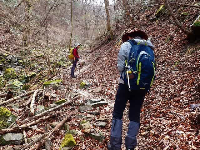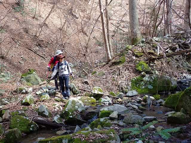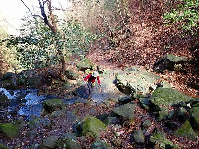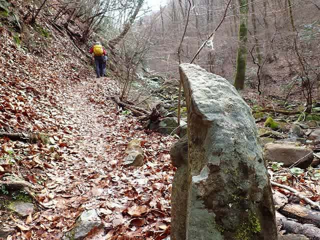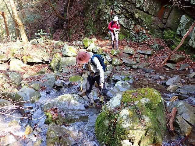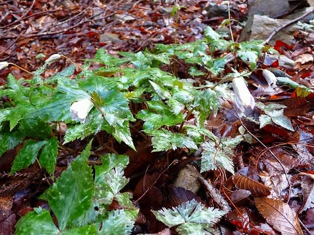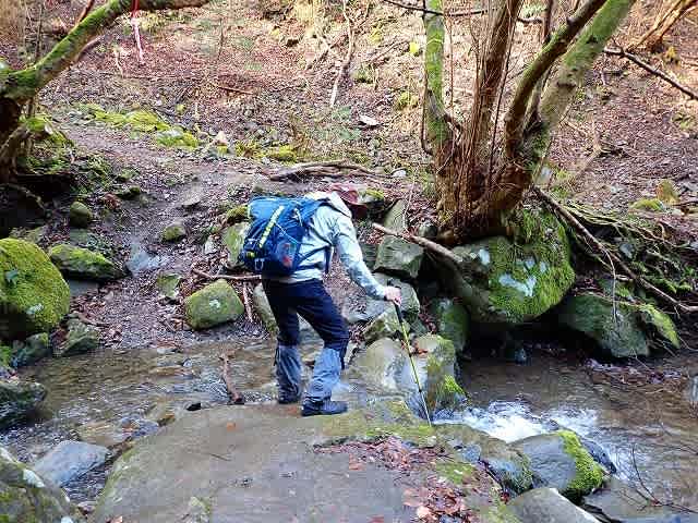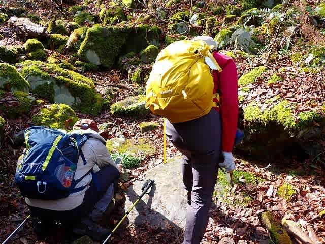 道は沢の右岸、左岸を渡渉しながら続いて行く。最初に目についたのは落ち葉の上に
