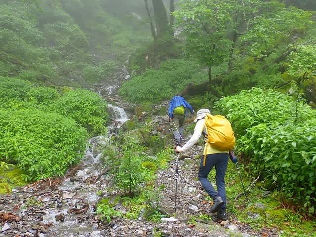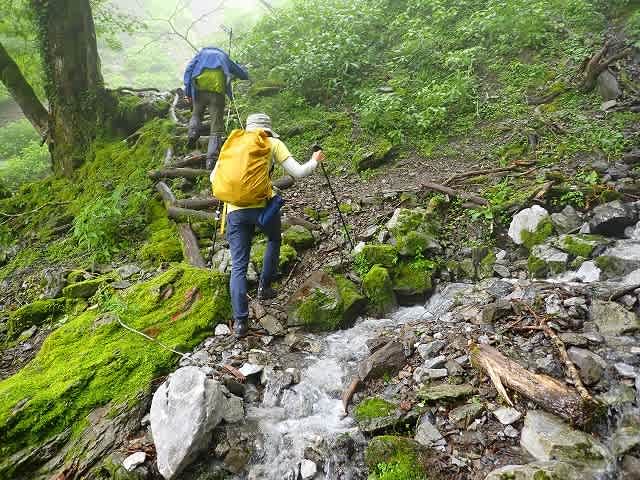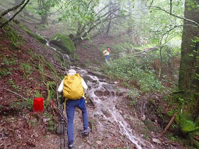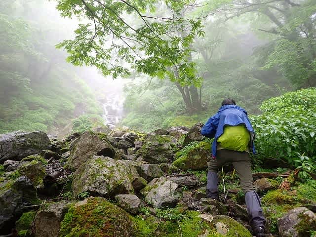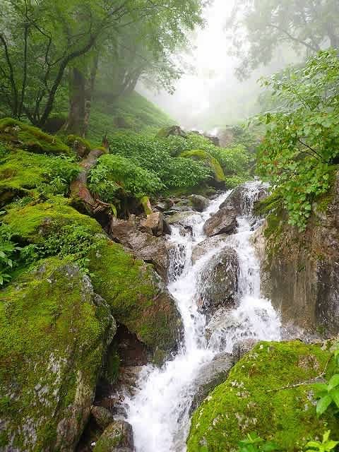 にも分かれて道の途中に流れ出ている。沢の上部には霧がかかり大きな音をたてて流れ
