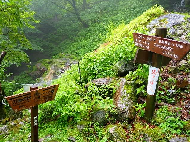 不動の岩屋の少し上が、刀掛けの松とおくさりの上部との分岐になる。先ほどから一緒