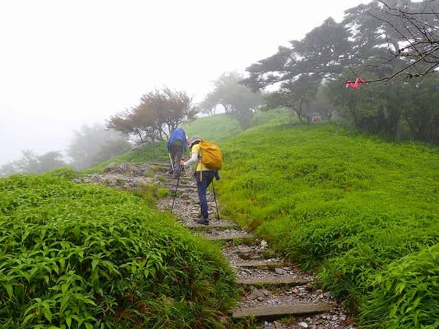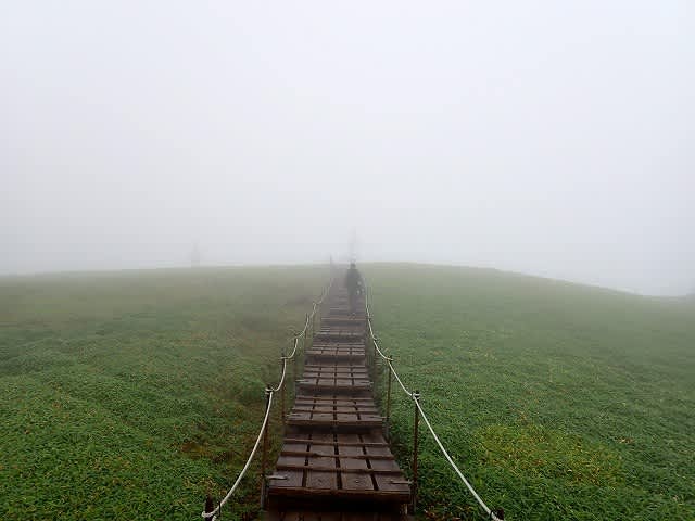 山頂の木道ではガスがかかってさらに南から風が吹き上げていた。体脂肪があと少しで
