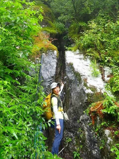 日はその割れ目の中の岩も鎖も濡れているので、さすがにあっちゃんも登ろうとはしな