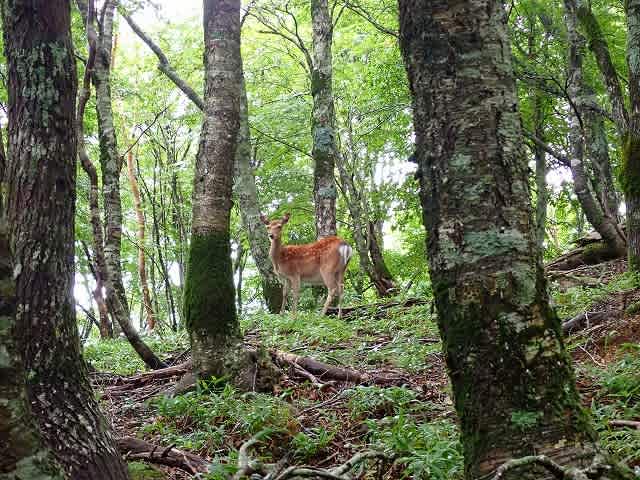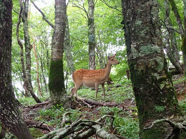 周りのブナやミズナラの木々も雨の後で瑞々しい。するといつも聞こえる鳥や鹿の鳴く
