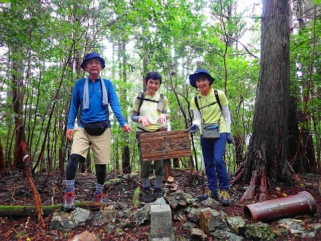 甫喜ケ峰山頂は木々に囲まれて眺望は無かった。文字の消えかかった山名板の前には、