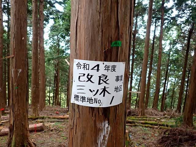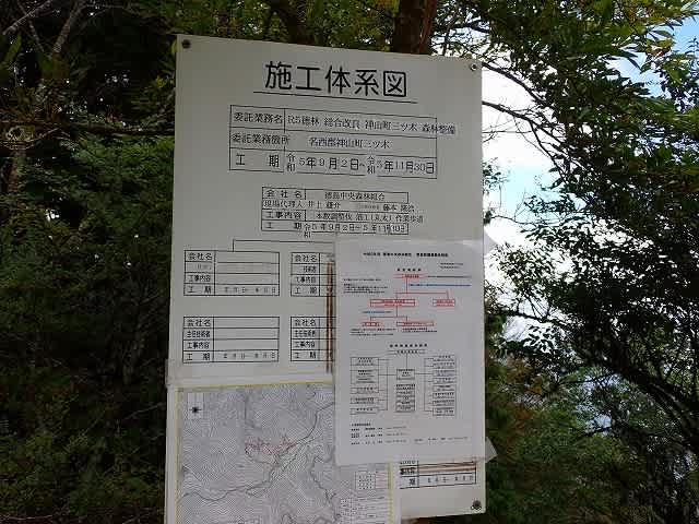 途中の道の脇で往路で見た森林整備の張り紙。この張り紙を見ると入札での工事現場で