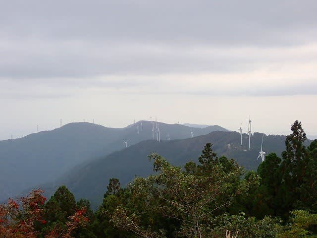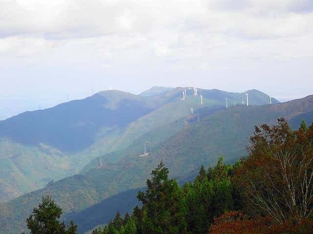 柴小屋山休憩所まで戻ってきた。東に朝方よりもはっきりと稜線上に続く風力発電が見