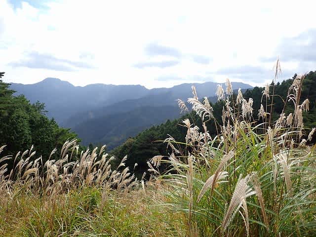 高根山の手前のススキがやっと差した日差しに輝いていた。高丸山までがまたひとつ遠