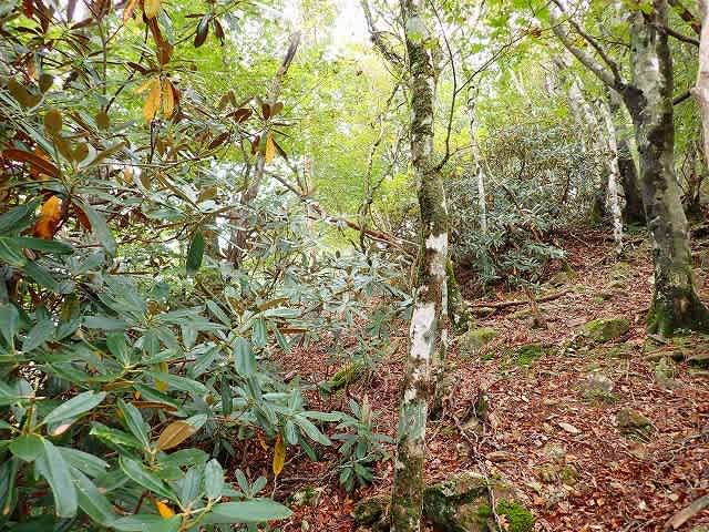 尾根の両側にシャクナゲの木が目立ち始める。開花の時期ならさぞ見応えがあるだろう。