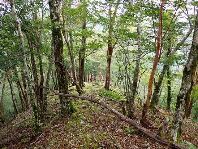 鞍部では細い幹のヒメシャラが目立つ。このルートの途中からは赤テープが目印になっ