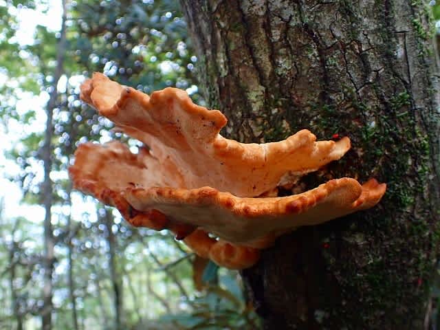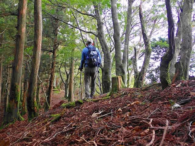 先程は左側が植林地だったが、山頂からは右手が植林地になる。自然林との境を下って