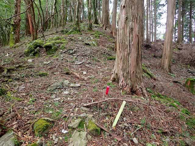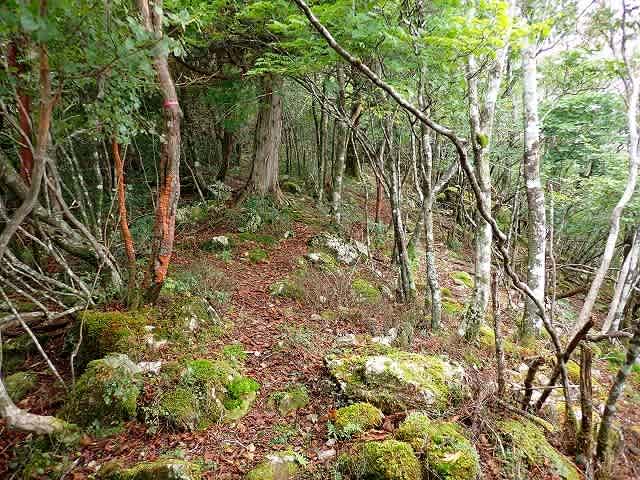 行くと突き当りの様になり、赤テープを目印に左に回り込み少し分かりづらい尾根を下