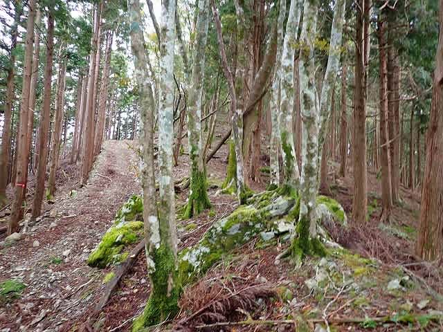 展望岩を過ぎると植林地の中の道になる。すると青色のテープで四角く囲われた場所に