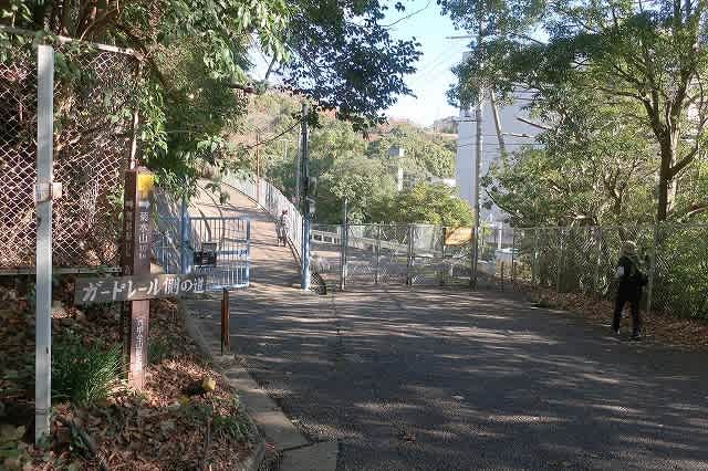 それより大きな『ガードレール側』と書かれた案内板。その方向を見やると門扉とフェン