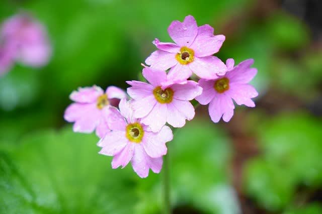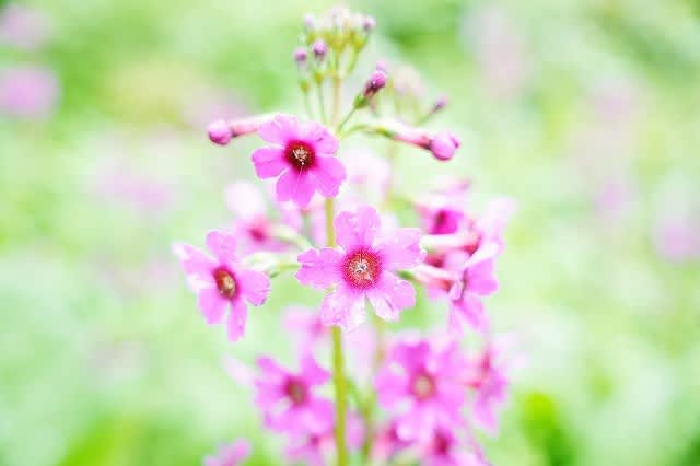 さん植えられ咲いている。クリンソウ、エビネランのどちらも独特な花の形と色をして