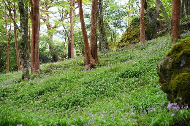 薄緑の林床の中に藤紫のヒメシャガの花が咲き、赤褐色のヒメシャラの木の幹が新緑の