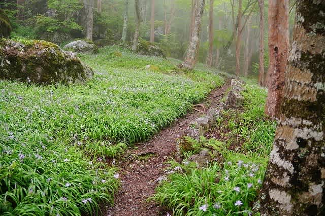 静かな森の中の小道の両側に隙間なくびっしりと咲いているヒメシャガ。花こそ違えど、
