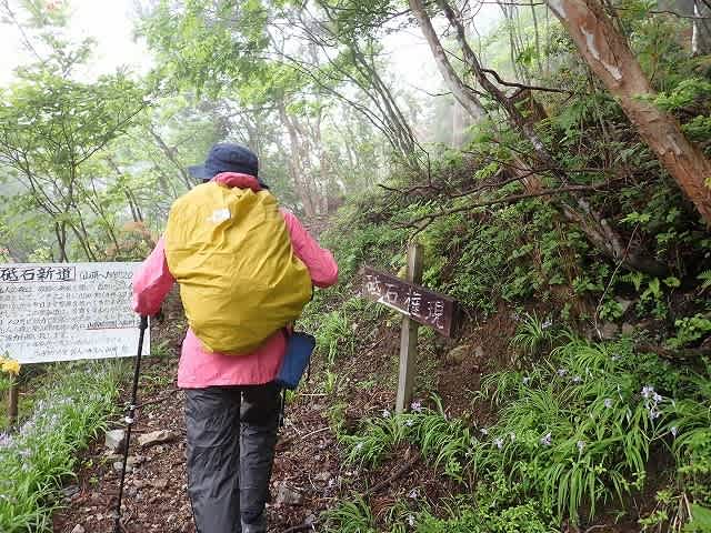 登山道に薄く霧がかかっているいる中、ひとりショボショボ登ってきた道を降りていく。