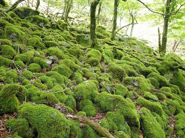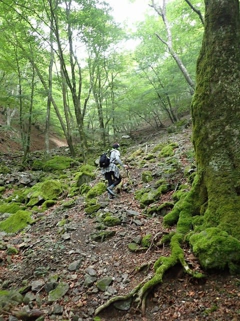 九折れの道をやり過ごすと道の脇が苔岩の斜面になる。
